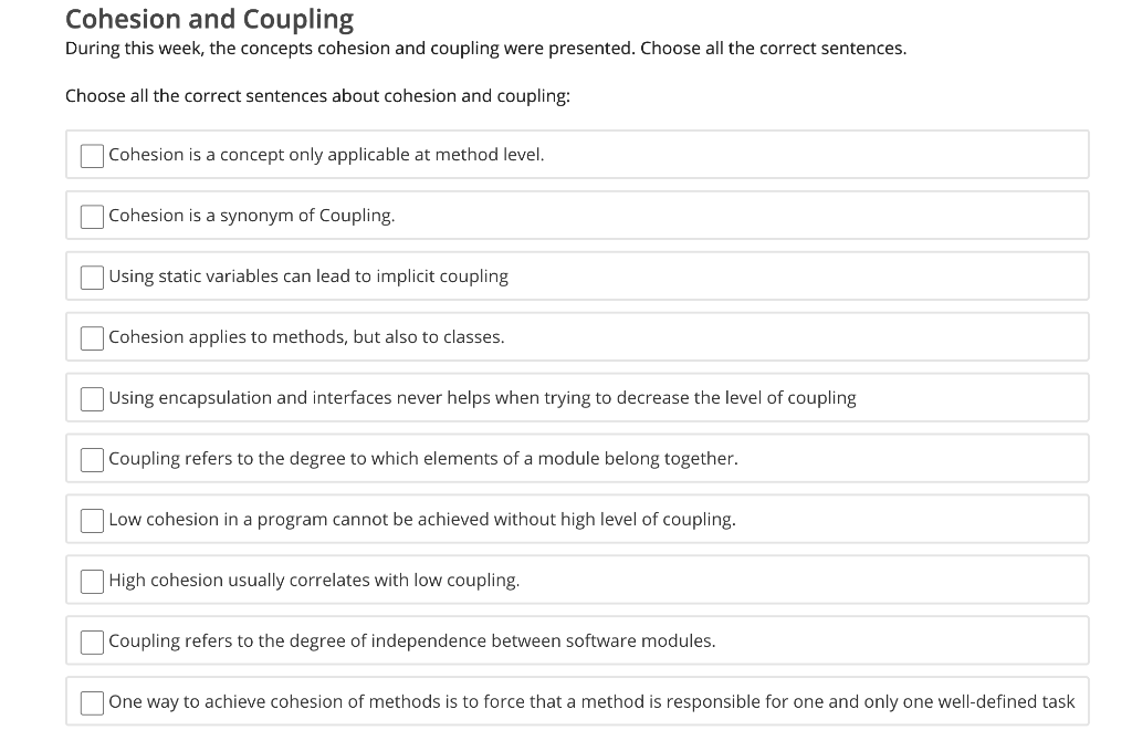 Solved Cohesion and Coupling During this week, the concepts Coupling Cohesion Questions Coupling refers to how much one part of a system relies on. Coupling and cohesion are key concepts in system design that help create efficient, maintainable software. Developed by larry constantine in the late 1960s, they have. Cohesion and coupling are common concepts in designing modular software systems. Frequently asked questions (faqs) on coupling vs cohesion 1. What is cohesion,. Coupling Cohesion Questions.