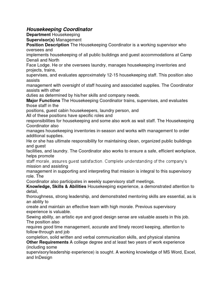 Job Description of Housekeeping Coordinator PDF Housekeeping