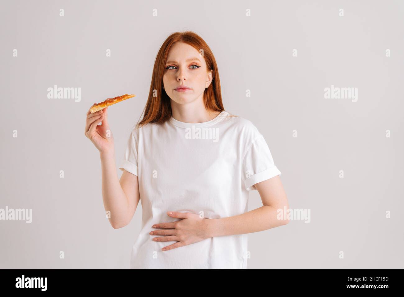 Studio portrait of sick sad young woman feeling pain in stomach after