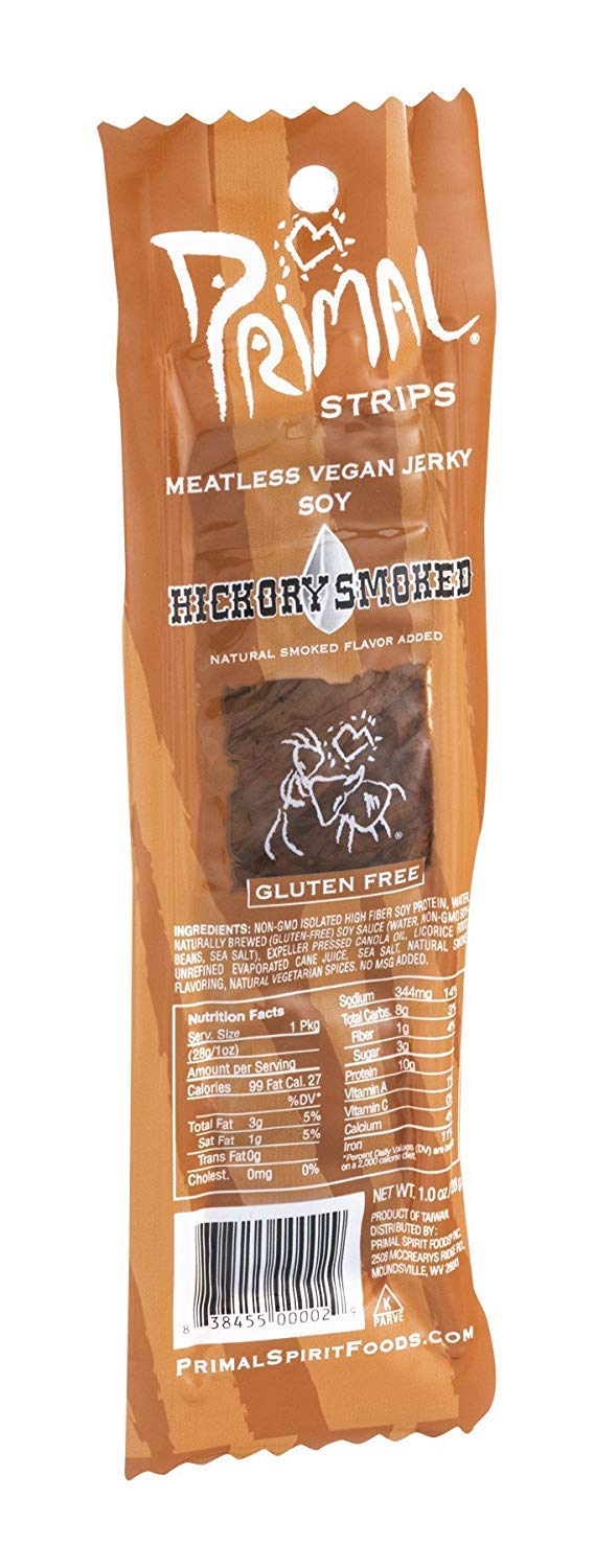 Primal Strips Hickory Smoke Bar Meatless Jerky, 1 Ounce Primal Meatless Jerky Fomerly known as primal strips, primal spirit vegan jerky comes in an array of meatless flavors. Low in fat and calories and a great source of b vitamins,. Primal Meatless Jerky.