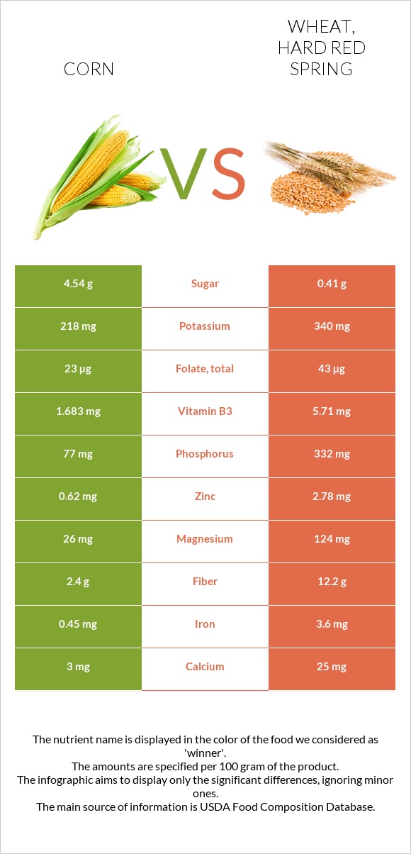 Corn vs. Wheat, hard red spring — InDepth Nutrition Comparison