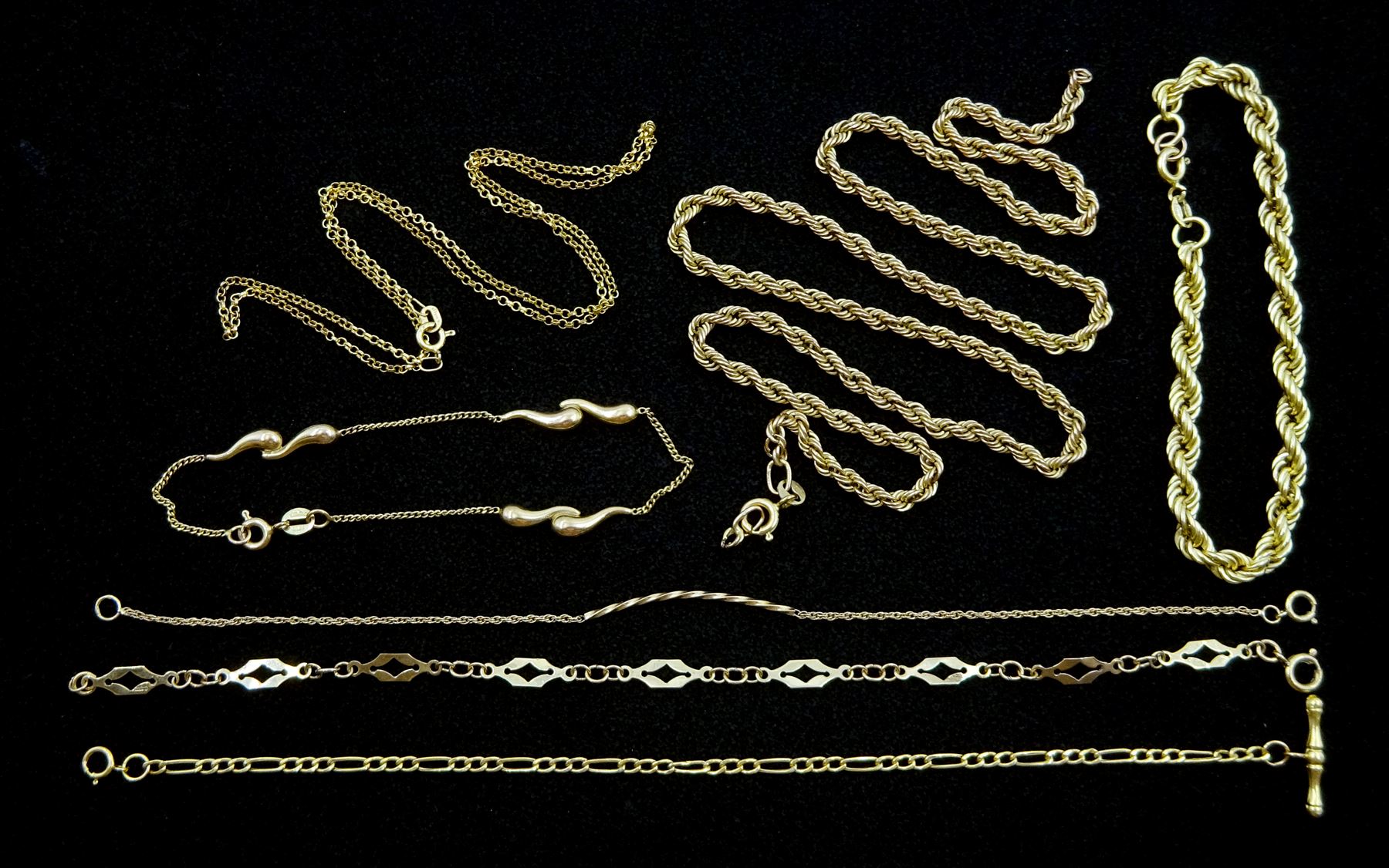 Gold rope chain necklace and bracelet, gold chain necklace and four gold bracelets, all 9ct