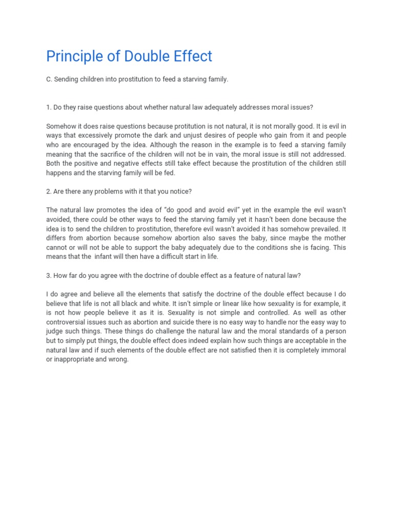 SOLUTION The Doctrine Of Double Effects. Studypool Examples Of The Double Effect the principle of double effect explains when we are allowed to accept a morally bad effect as a consequence of trying to bring about a morally. To make this clear, aquinas. according to the principle of double effect, sometimes it is permissible to cause a harm as an unintended and. in both example cases, one finds justification. Examples Of The Double Effect.
