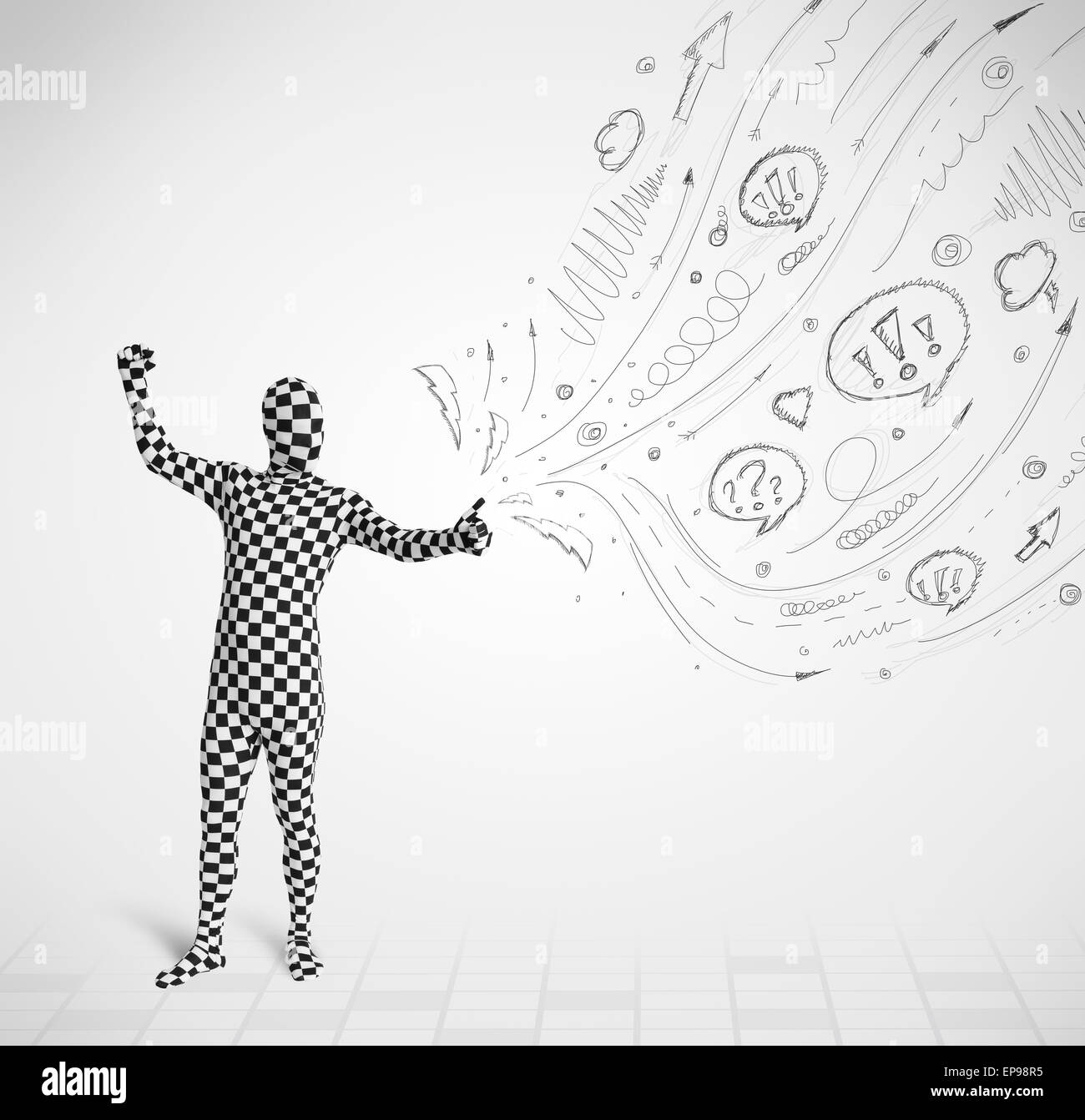 Guy in body suit morphsuit looking at sketches and doodles Stock Photo