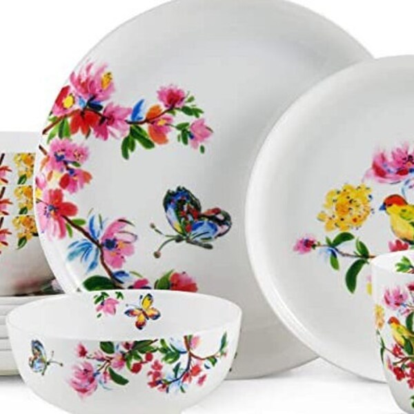 Bird and butterfly lazy susan serve tray. Adorned with a watercolor bird. Plates in square shapes with curved corners and mugs and bowls that carry the floral pattern through the insides make for. Crafted of crisp white bone china that makes the colorful pattern pop, this charming collection is. We'll take it back, no questions. 11 inch dinner plate, 9 inch salad plate, 6 inch (26 ounce) soup. 16 piece dinnerware set, service for four, includes (4) each: Crafted of crisp white bone china that makes the colorful pattern pop, this charming collection is. Beautiful nature pattern with watercolor bird and butterfly design. This item does not qualify for discounts or rewards redemptions.