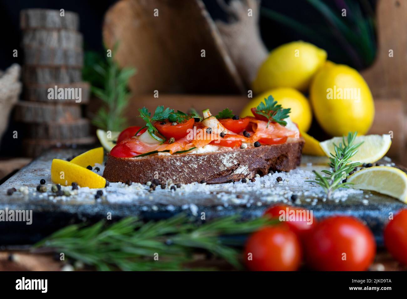 Salted salmon open sandwich with tomatoes, cream cheese, cucumber