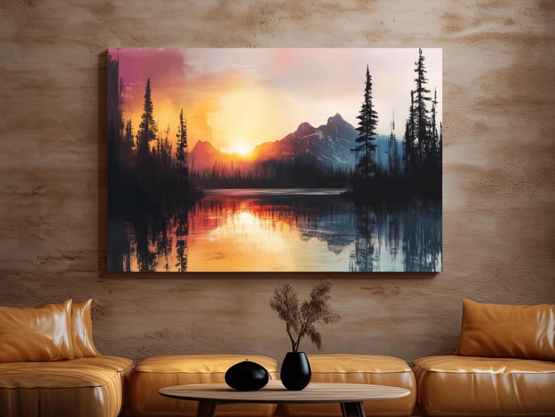 Abstract Mountain Art Painting, Sunset Over a Lake and Forest Canvas