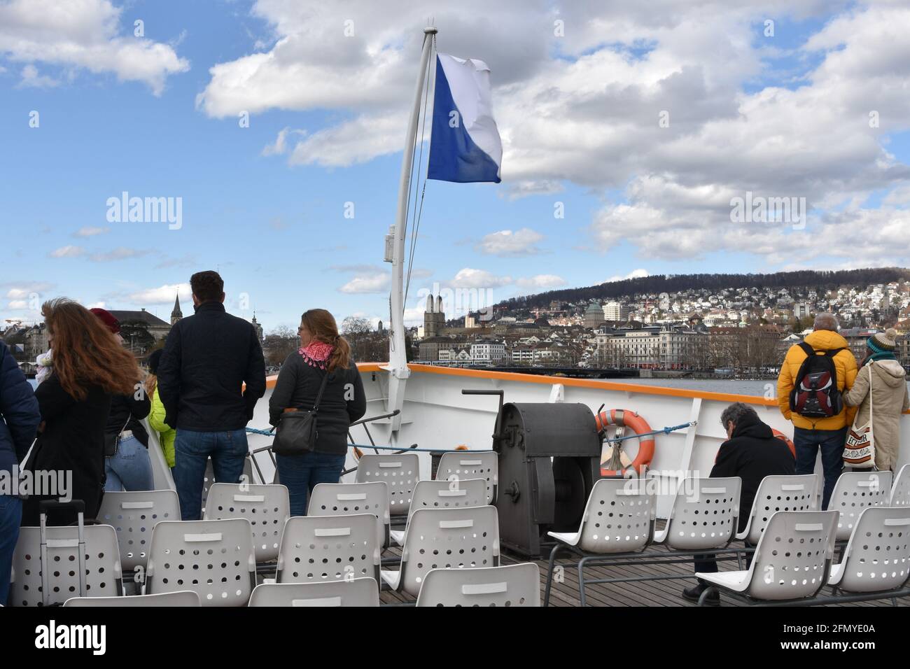 Passengers standing on bow of cruise ship on Lake Zurich Stock Photo