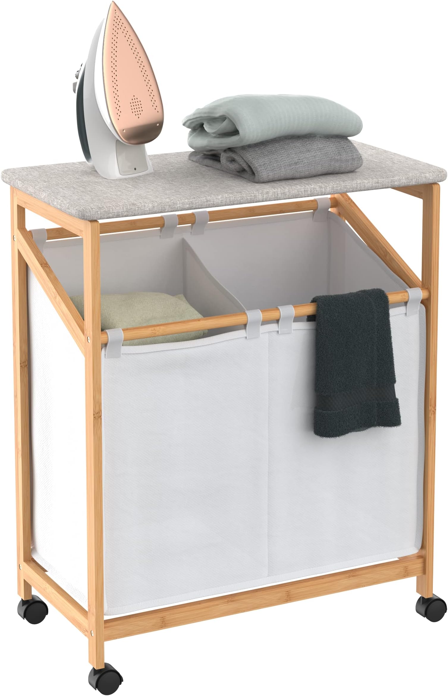 This double sorter with an ironing board top keeps your laundry room organized so you can be more efficient on laundry day. Hang dry your favorite dresses on the drying bar and. This triple threat hamper + ironing board + drying bar laundry center is compact and filled with functionality to keep your days efficient. Split up your laundy by darks and lights, or separate delicates. Split up your laundy by darks and lights, or separate delicates. This double sorter with an ironing board top keeps your laundry room organized so you can be more efficient on laundry day. Polyester, cotton, steel imported 3 bin laundry sorter with removable bags large hamper with ironing board that easily lifts up locking wheels. Easy and simple to assemble, no power tools necessary.