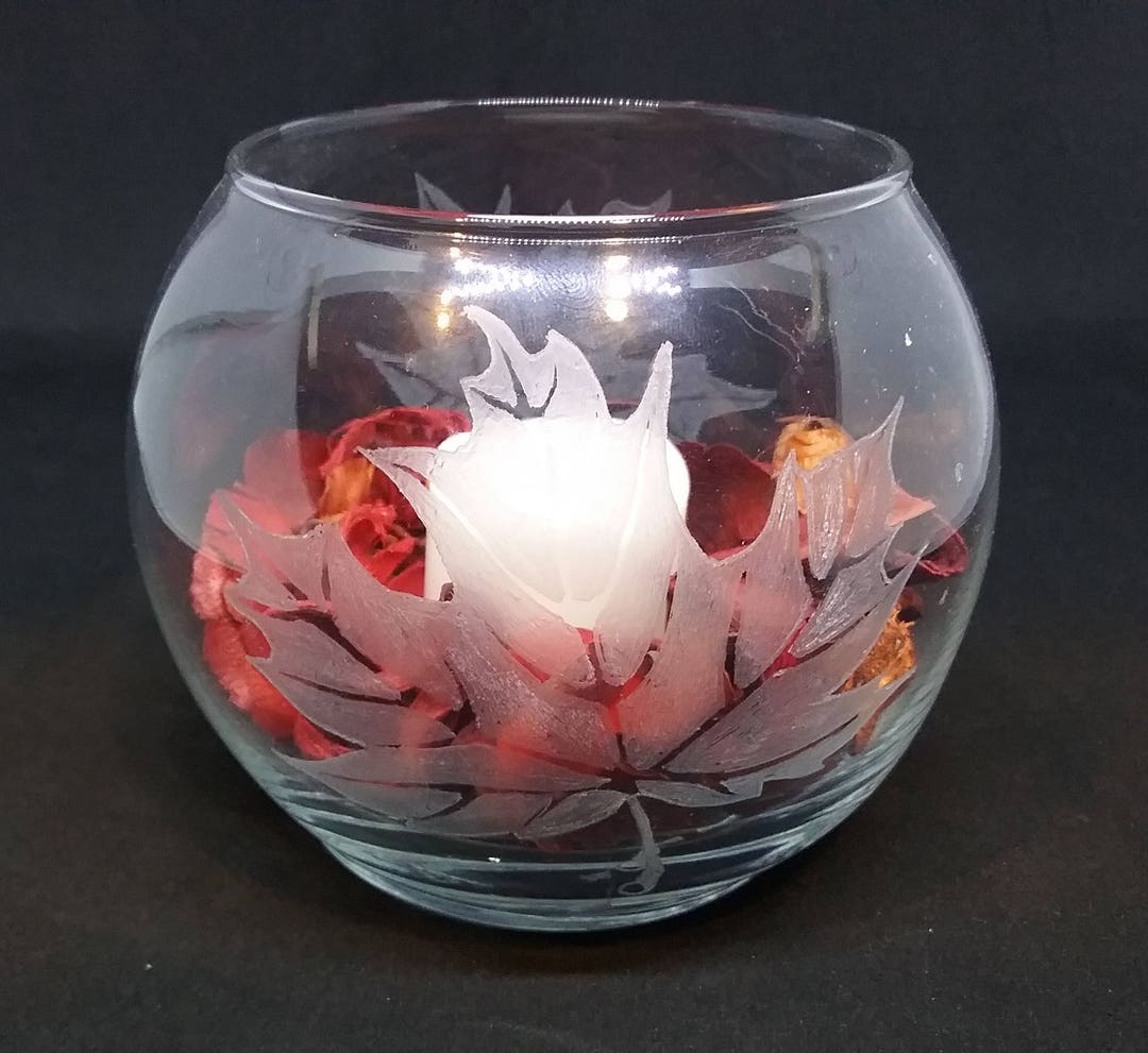 Hand Etched Glass Bubble Candle Holder. Maple Leaf. Etsy