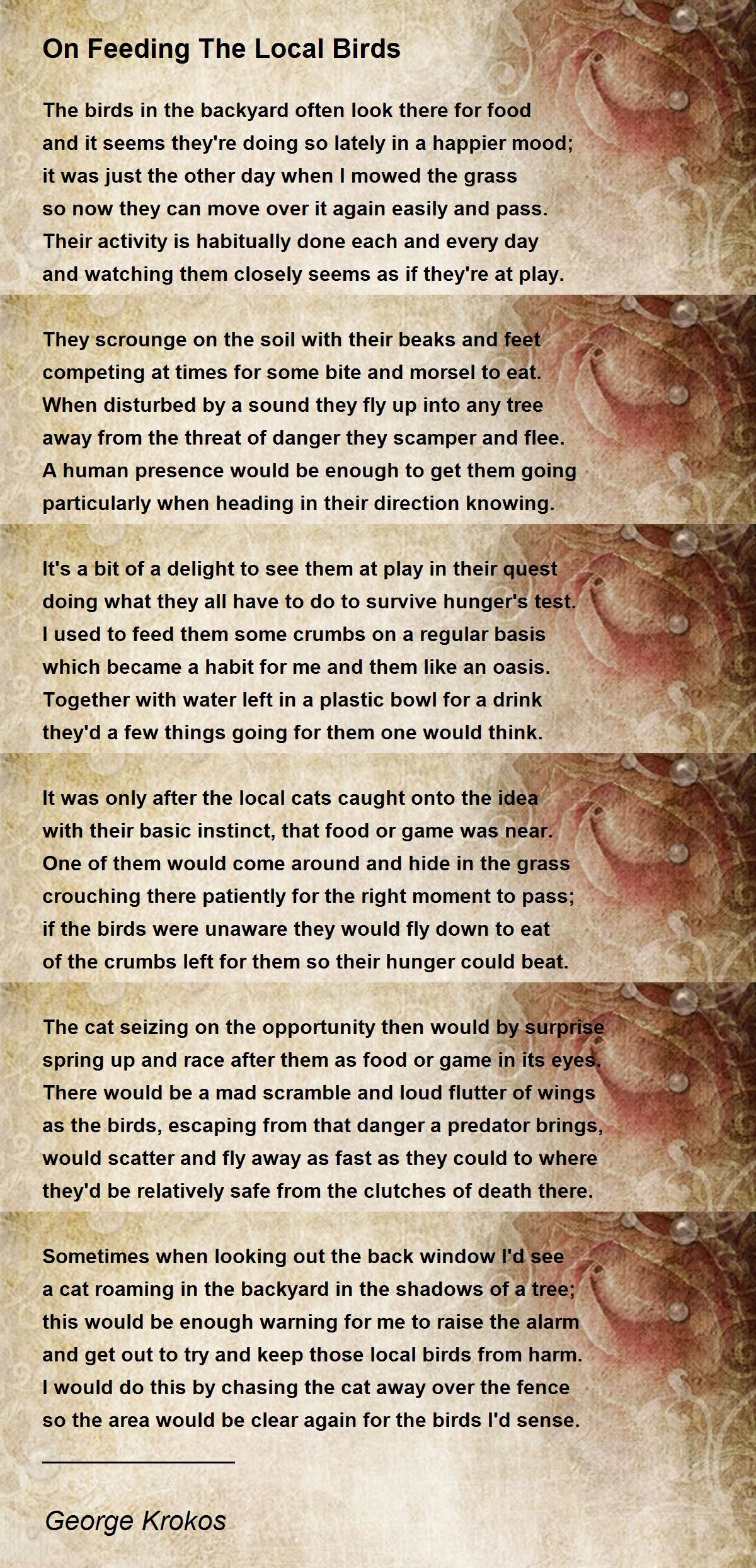 On Feeding The Local Birds On Feeding The Local Birds Poem by Feeding Birds Poem In this article, we will explore a collection of poems that pay homage to the joy of feeding birds and the profound connection it creates between. That frequented the bird bath she. A poem about feeding the birds, especially in the winter. Birds are everywhere in poetry, so compiling this list of ten of the greatest bird poems has involved. Feeding Birds Poem.