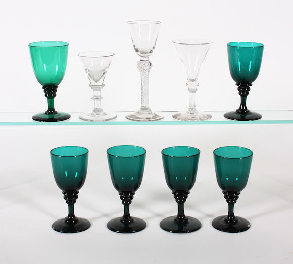 Bonhams Six greentinted wine glasses, an airtwist glass and two