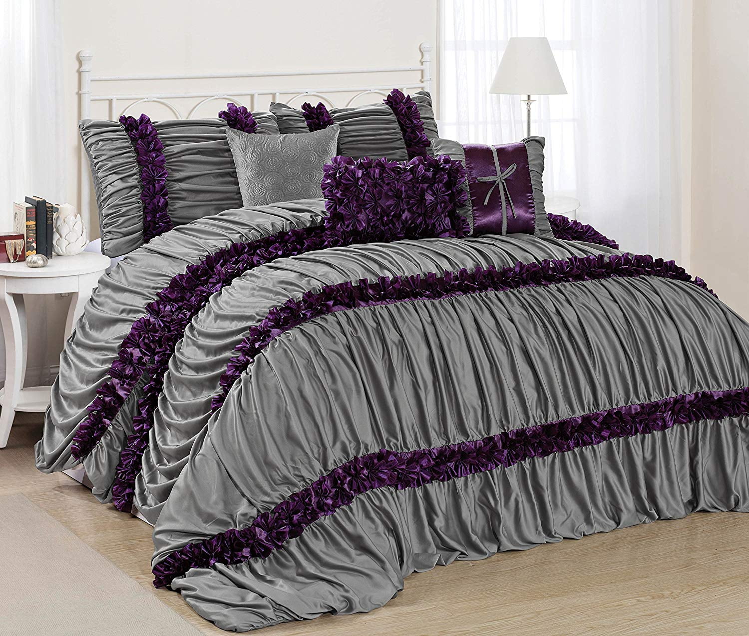 HIG 7 Piece Comforter Set Queen Gray Microfiber Ruffle and Patchwork