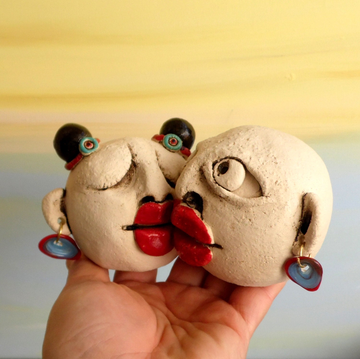 Ceramic sculpture of kissing couple heads lovers sculpture