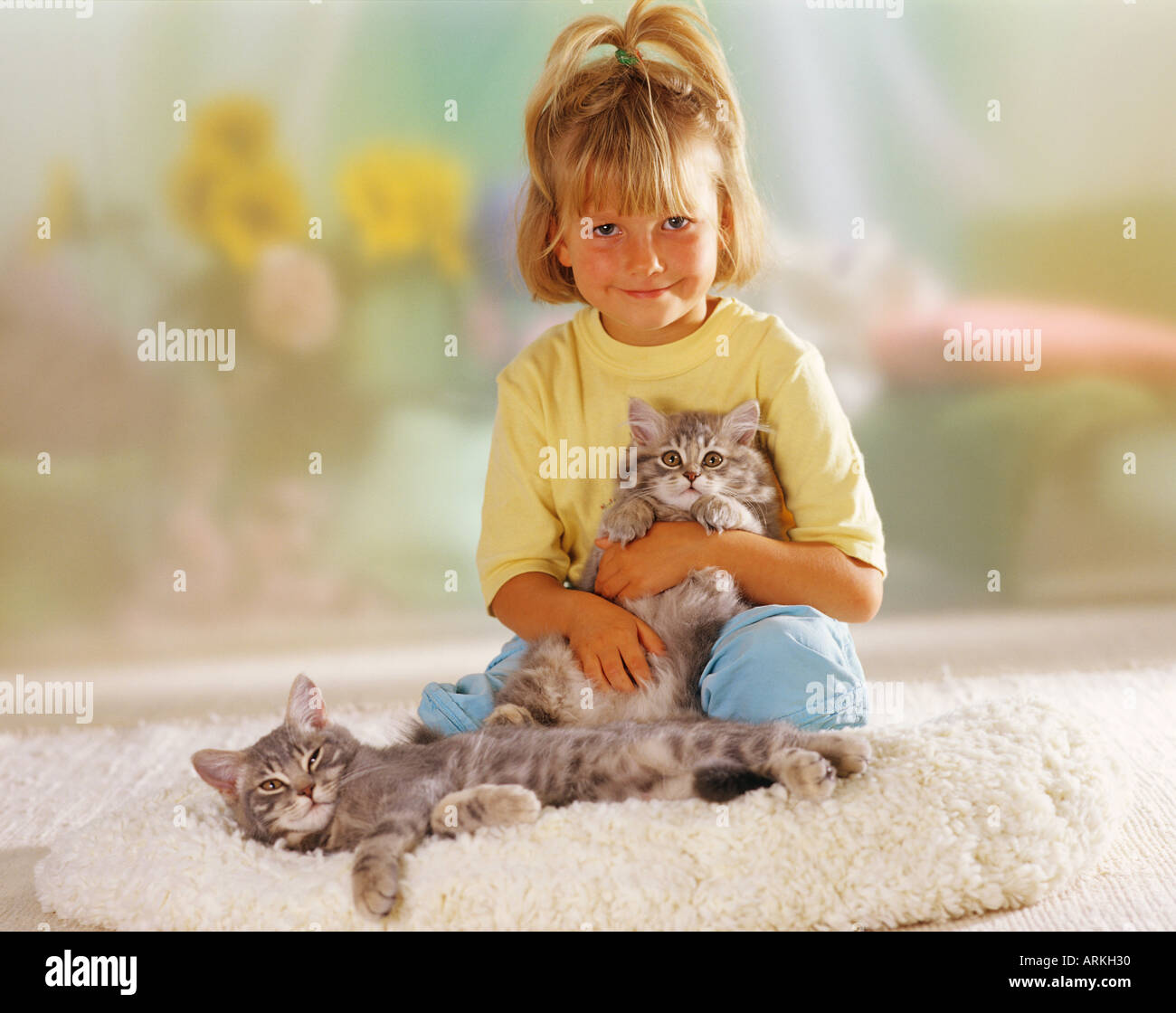 girl with two domestic cat kitten Stock Photo Alamy