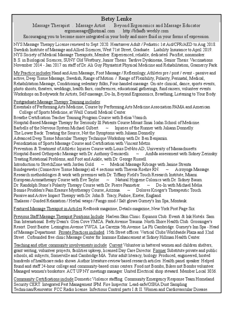 Experienced Nys Massage Therapist Betsy Lenke PDF Massage Physical Therapy