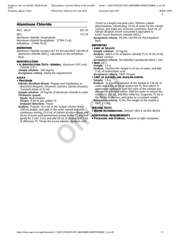 Aluminum Chloride, Hexahydrate, USP, 95102, Spectrum Chemical Aluminum Chloride Sds Sigma Sodium chloride product number : view or download the aluminium chloride msds (material safety data sheet) or sds for 845019 from merck. Aluminum chloride hexahydrate product number : Aluminum Chloride Sds Sigma.