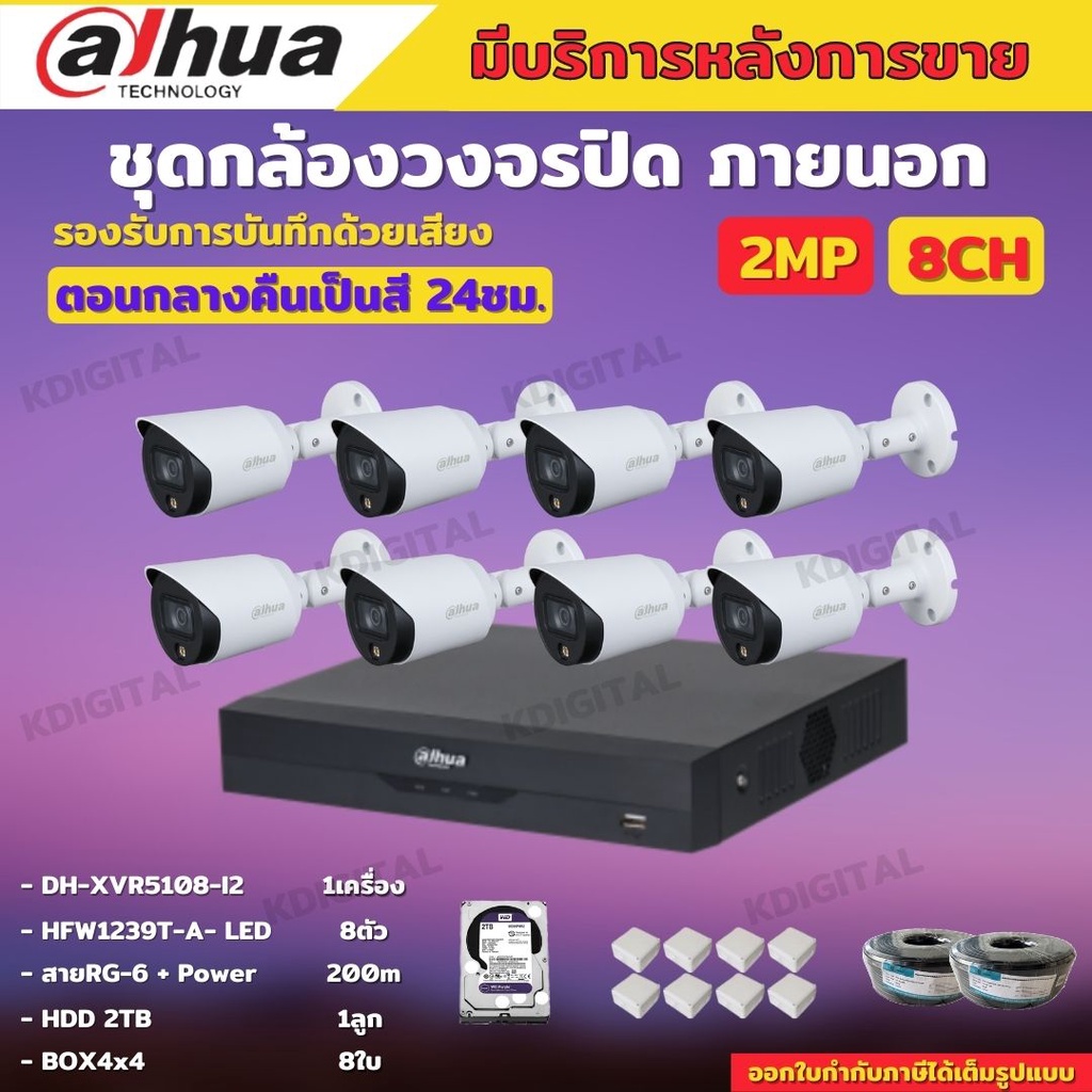 Dahua ชุดกล้องวงจรปิด8ตัว 2ล้านพิกเซล ภาพสี24ชม.มีเสียงในตัว HFW1239TA