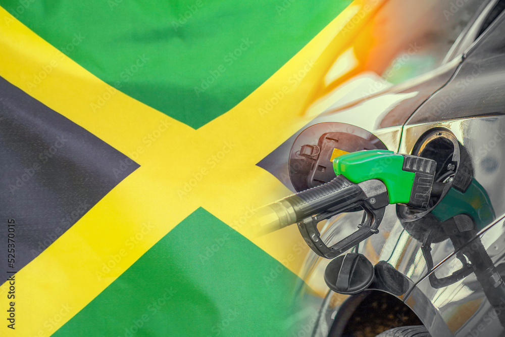 Car with a fuel injector on Jamaica flag background. Record prices fuel