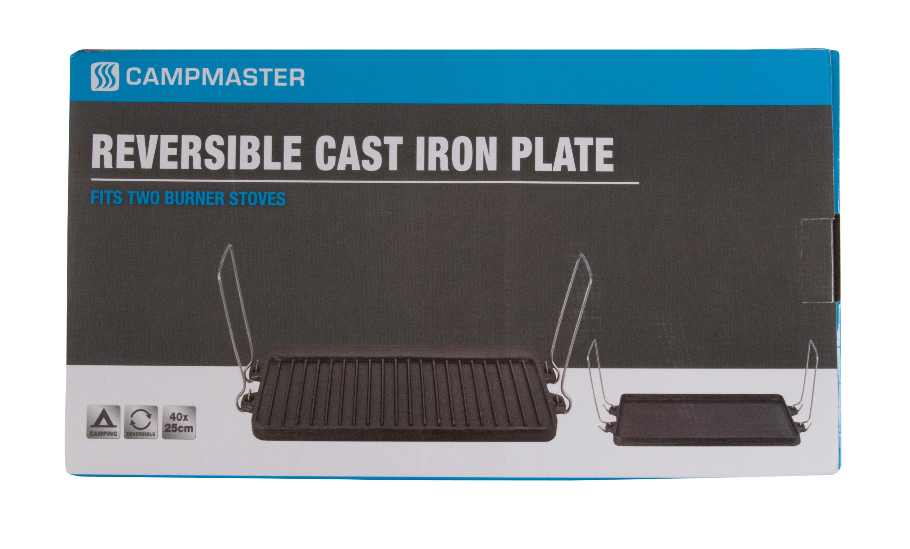 Campmaster 2 Burner Reversible Cast Plate Campmaster NZ Campmaster Grill Plate This two burner reversible cast iron plate with wire handles is an ideal addition to barbeques, 2 burner country cookers (model cm1082) or even open fire cooking. Perfect for camping, caravanning, picnics, home use or anywhere you want to cook great food. Eat better, wherever with campmaster! For over 25 years campmaster® has been the leading brand for all camping. Campmaster Grill Plate.