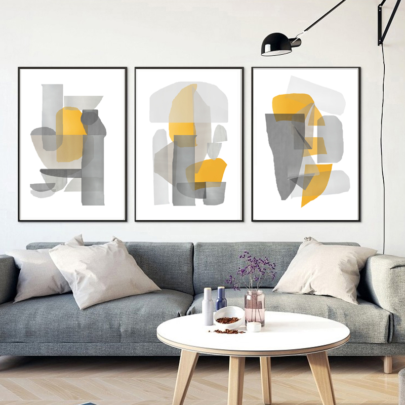 Three Prints Abstract Poster Yellow Grey Wall Art Geometric Inspire