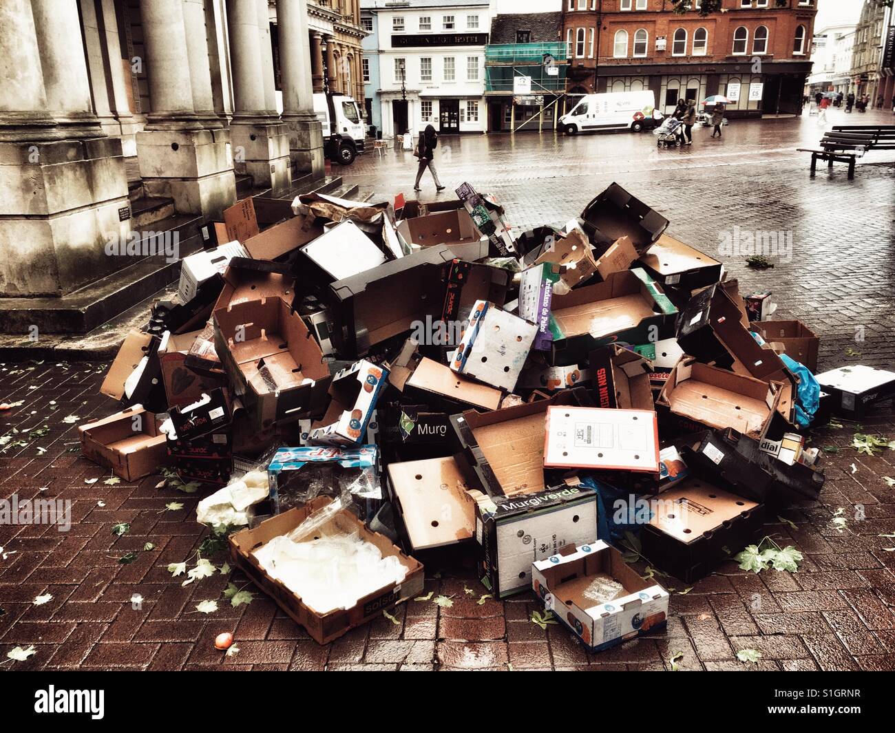 Cardboard boxes left in the street after market Day, Ipswich Stock