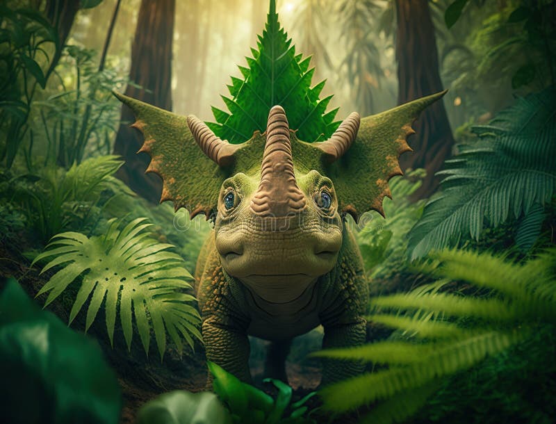 A Dinosaur with a Green Leaf on Its Head in a Forest. Generative Ai