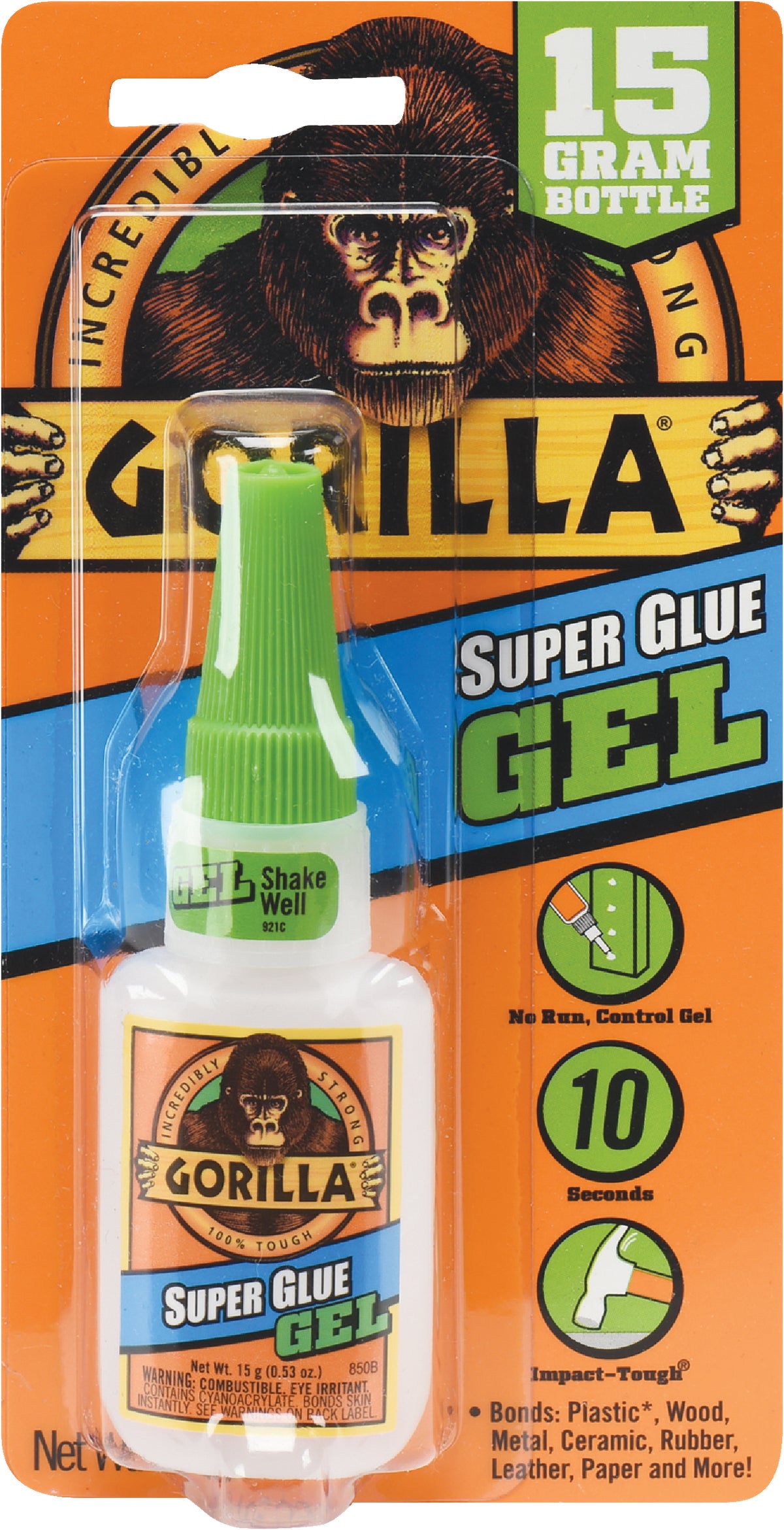Super Glue Gel Gorilla This particular product is a thick gel, which allows for better control when applying. Great for vertical surface applications. This super glue gel is specially formulated to withstand drops and impacts. Great for rough & uneven surfaces. No drip, no run, no mess. Super Glue Gel Gorilla.