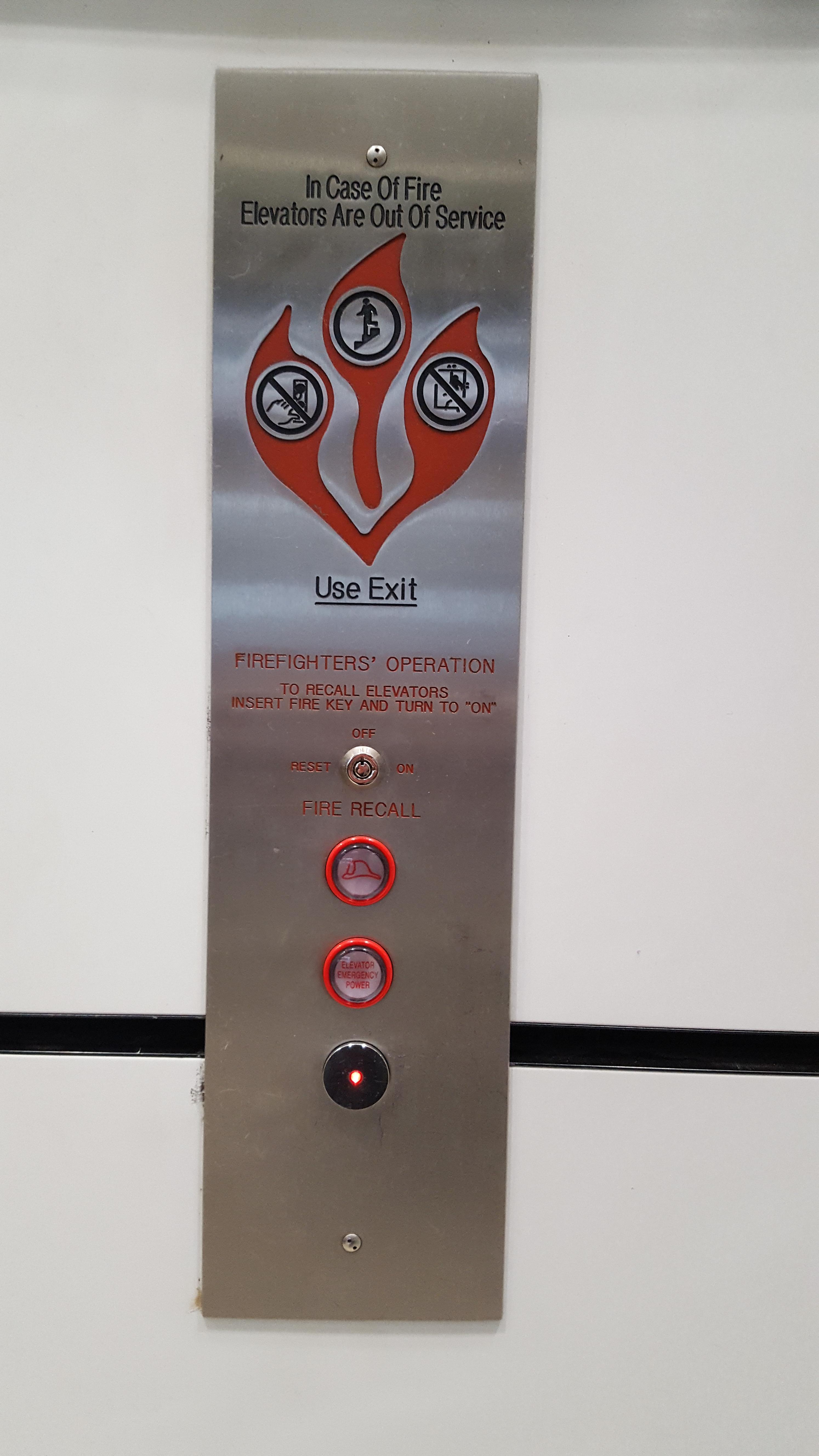 Elevator call button is the silver one on the bottom, emergency buttons