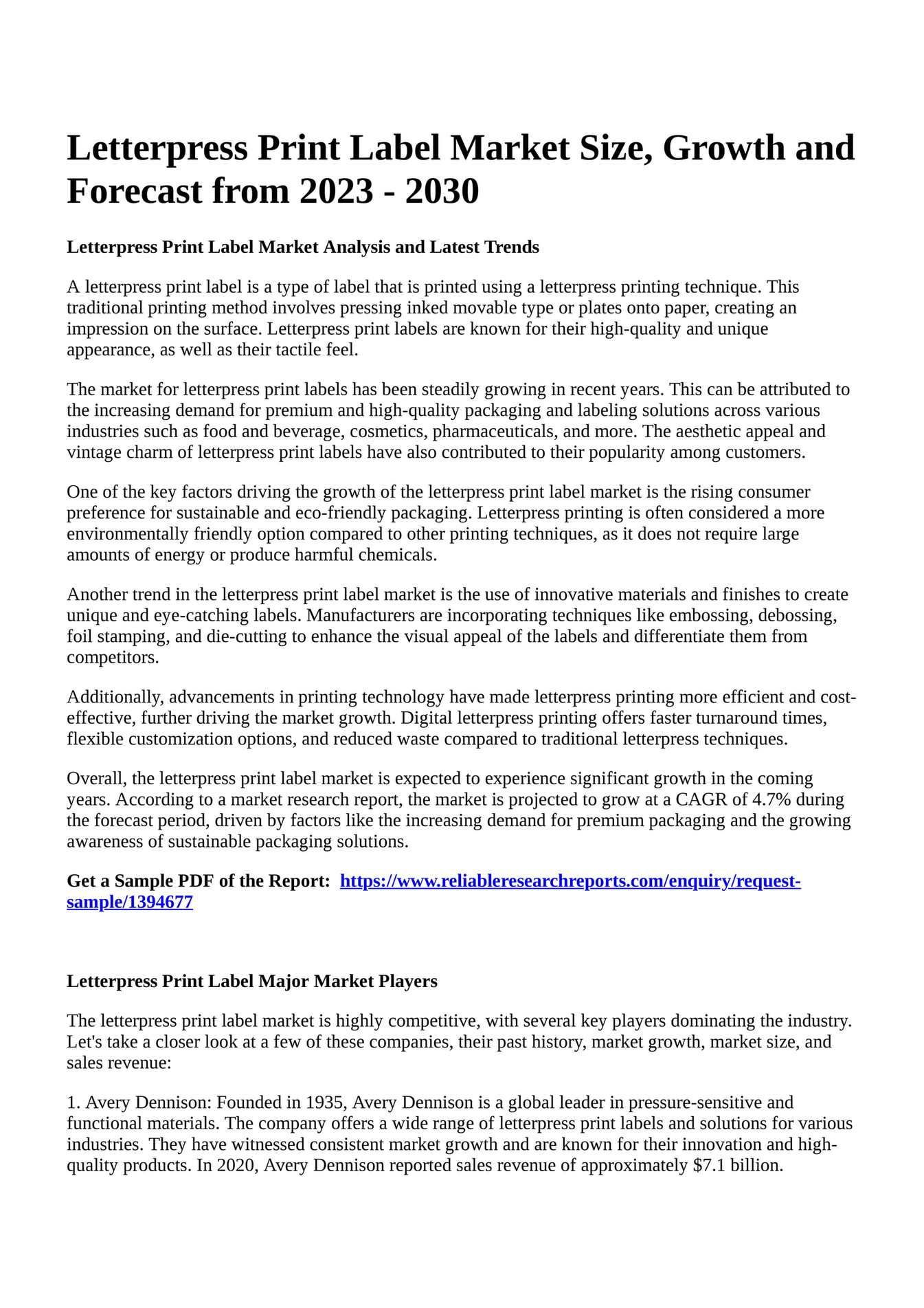 Reportprime Letterpress Print Label Market Size, Growth and Forecast