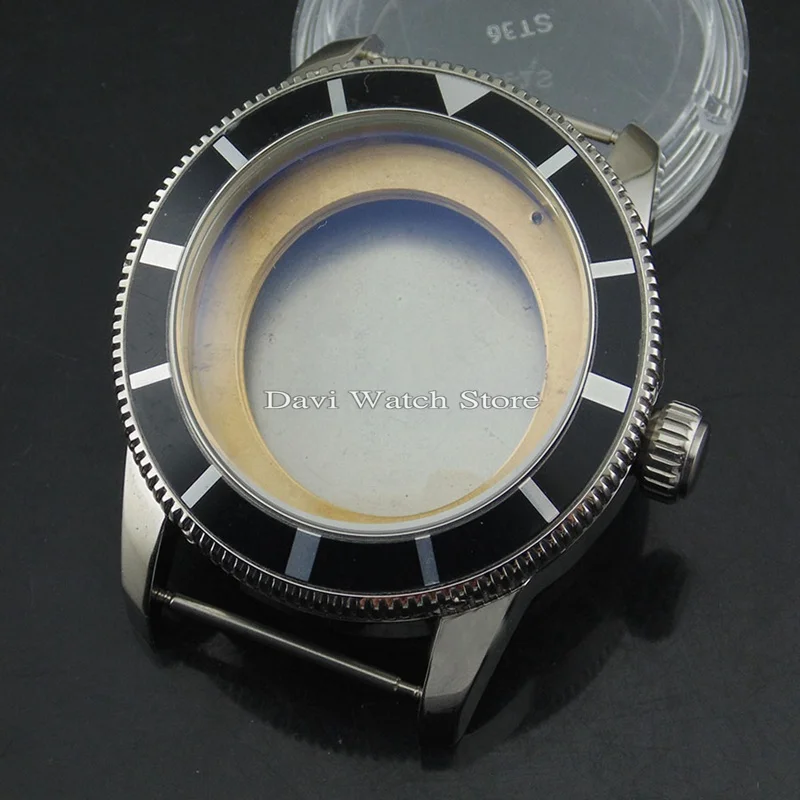 46mm silver case black bezel Steel Watch Case fit ETA 2836,DG2813/3804 Watch Case For Eta 2836-2 this 10 atm water resistant case is made of 100% stainless steel, has a hardened 35.50 mm diameter x 2.30 mm thick mineral. 100% stainless steel case. submariner watch case with sapphire crystal and ceramic bezel. Case style #4 with solid back stainless steel. Watch Case For Eta 2836-2.