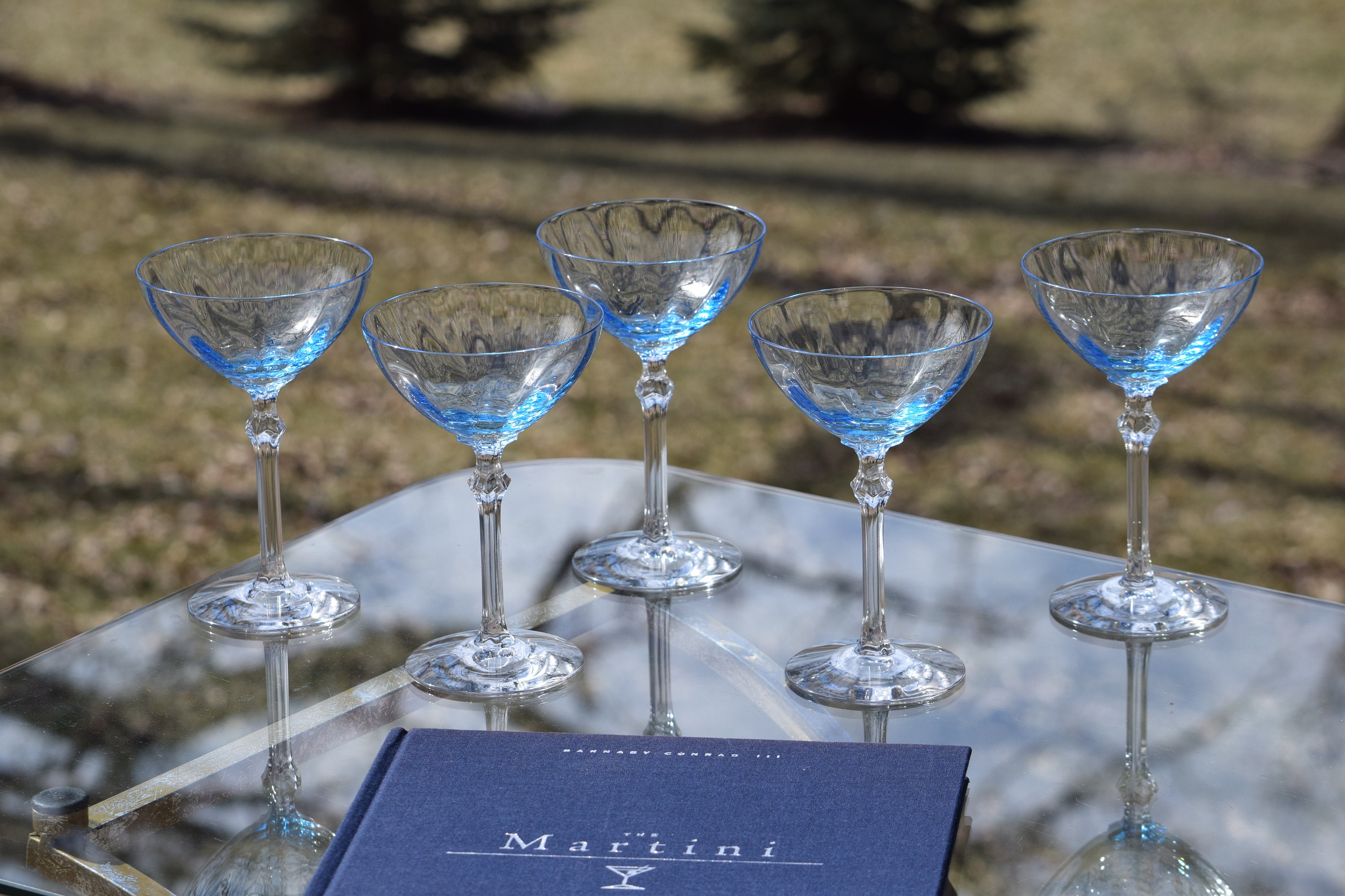 Vintage Blue FOSTORIA Optic Crystal Cocktail Coupe Glasses, Set of 5, Fostoria, Blue, circa 1928