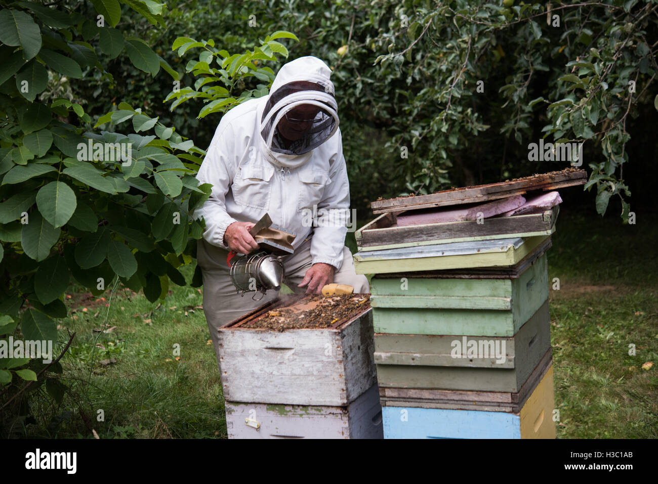 Fogging smoker beekeepers tool to keep bees away from hive Stock Photo Fogging Bee Hives Preparing the oxalic acid, setting up your fogger, and preparing the hive. Oxalic acid fogging for varroa mites. The process of injecting oxalic acid into a beehive using a fogger is known as oxalic acid fogging. Often, it's cold enough to confine the bees, if not to their hives, at least to their own yards. Simply take off your hive. Fogging Bee Hives.