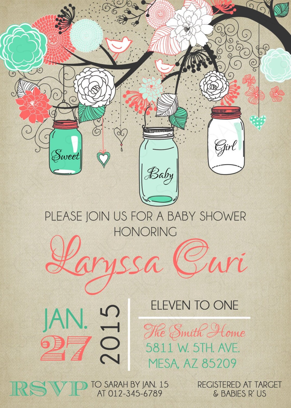 Mason Jars Baby Shower Invitation Baby Girl Coral Mint Etsy