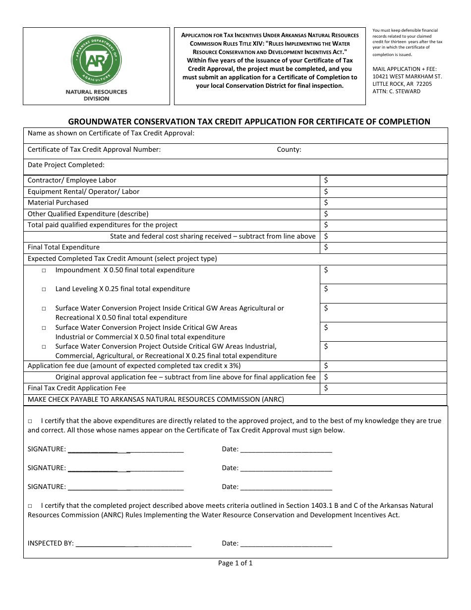 Arkansas Groundwater Conservation Tax Credit Application for