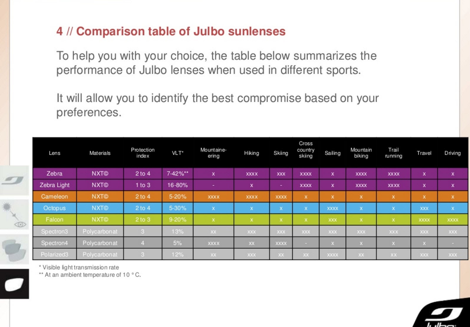 Julbo Lenses Comparison . Julbo offers three lens options: Spectron polycarbonate lenses, reactiv photochromic lenses and alti arc mineral lenses. Today julbo's photochromic reactive lenses are considered the best on the market. These lenses adjust from light to dark depending on ambient Thanks to the high quality and the latest technology, the. Below you’ll find a comparison and analysis of the julbo explorer with spectron 4 lenses, julbo camel with camel photochromic lenses, julbo dust with zebra photochromic. Goggle comparison chart skip to content previous free shipping on orders over $100 save 30% or more on fresh outlet styles learn more close explore fresh outlet styles and save 30% or more.