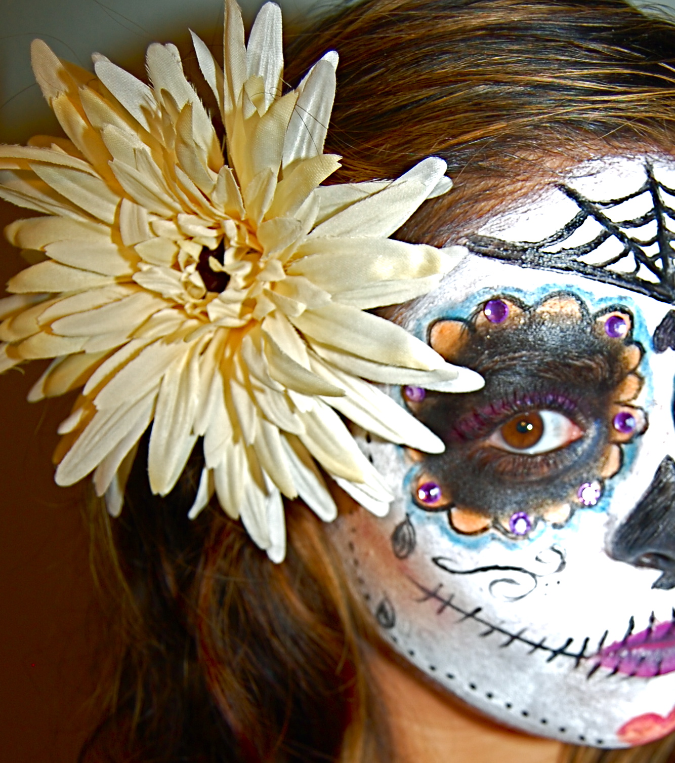 Closeup portrait of Calavera Catrina. Little girl with sugar skull Halloween Makeup Catrina For those who crave a modern and vibrant twist on catrina makeup, neon catrina makeup is the answer. This gorgeous día de los muertos makeup uses a blue butterfly theme to put a vibrant twist on the classic catrina makeup. The catrina makeup includes the same features, but painted with bright colors, embellishing floral motifs, scalloped edges on the eye. Halloween Makeup Catrina.