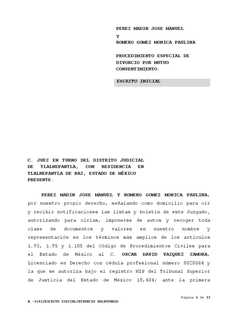 Escrito Inicial de Divorcio Voluntario Divorcio Matrimonio Prueba
