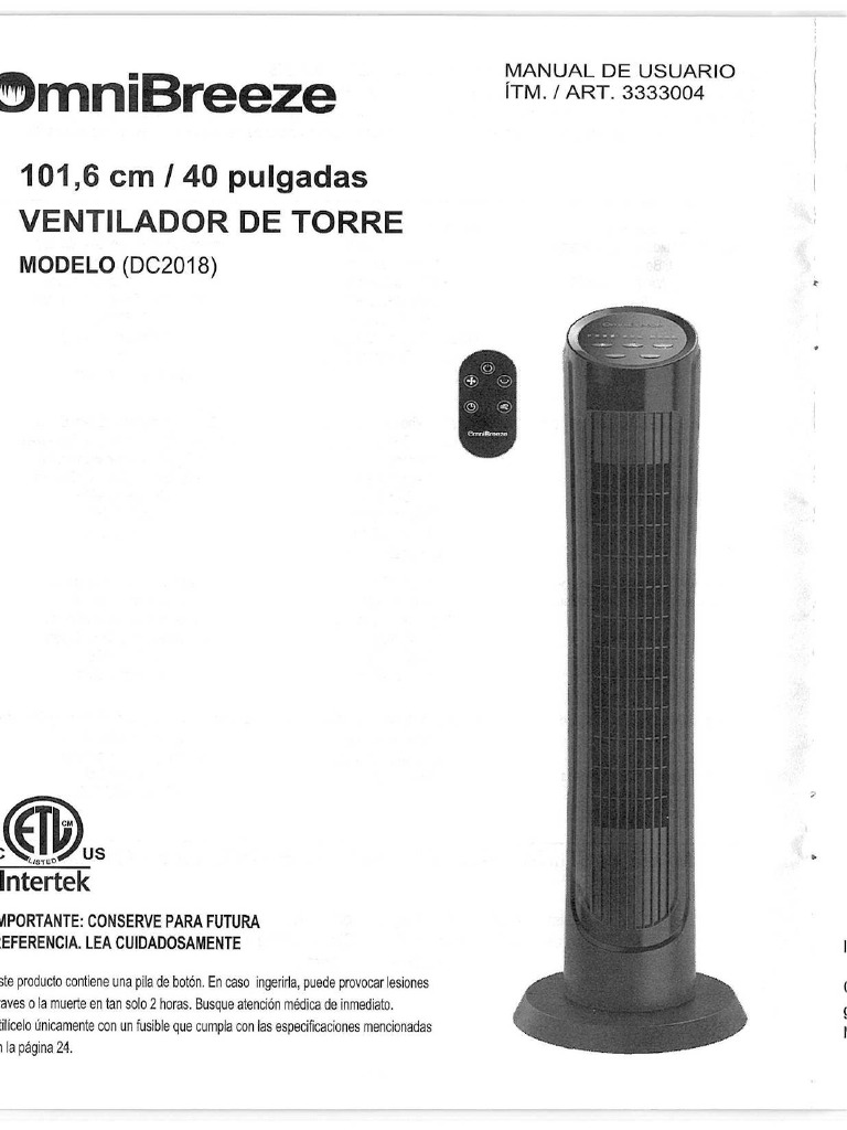 OmniBreeze Tower Fan Model DC2018 Owner's Manual (ES) PDF