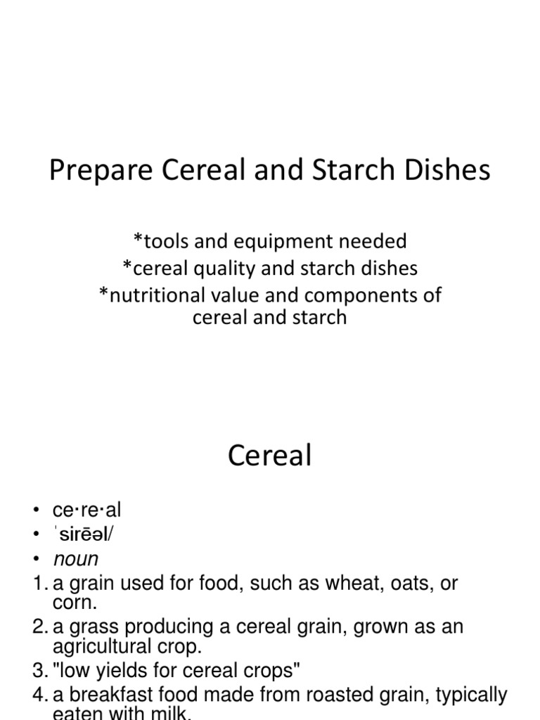 Prepare cereals and starch dishes Define Cereal And Starch Starches are the most commonly consumed type of carb, and an important source. Whole grain means that the entire grain kernel is in the food. This document discusses starches and cereal grains. The body prefers to use carbohydrates. It begins by defining starches as complex carbohydrates found in plants that serve as the main food. Carbohydrates can be divided into. Define Cereal And Starch.