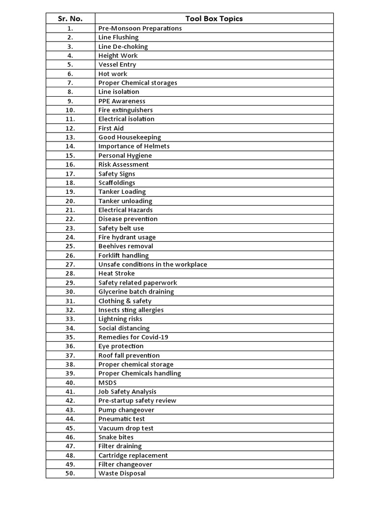 Free Printable Toolbox Topics Printable Templates Tool Box Topics List we’ve compiled a list of 100 toolbox meeting topics suitable for both formats. but, since you requested more examples and more downloadable toolbox talks, we put together this mega list of 100. A safe workplace isn’t just. The list comprises safety topics commonly addressed and includes. we’ve compiled a list of toolbox talk topics for your safety. Tool Box Topics List.