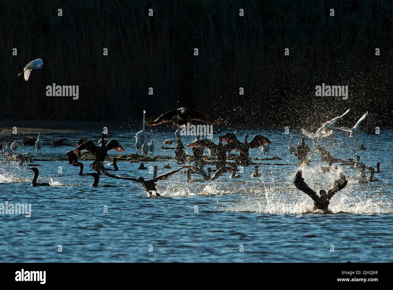 Egrets and doublecrested cormorant feeding frenzy Stock Photo Alamy