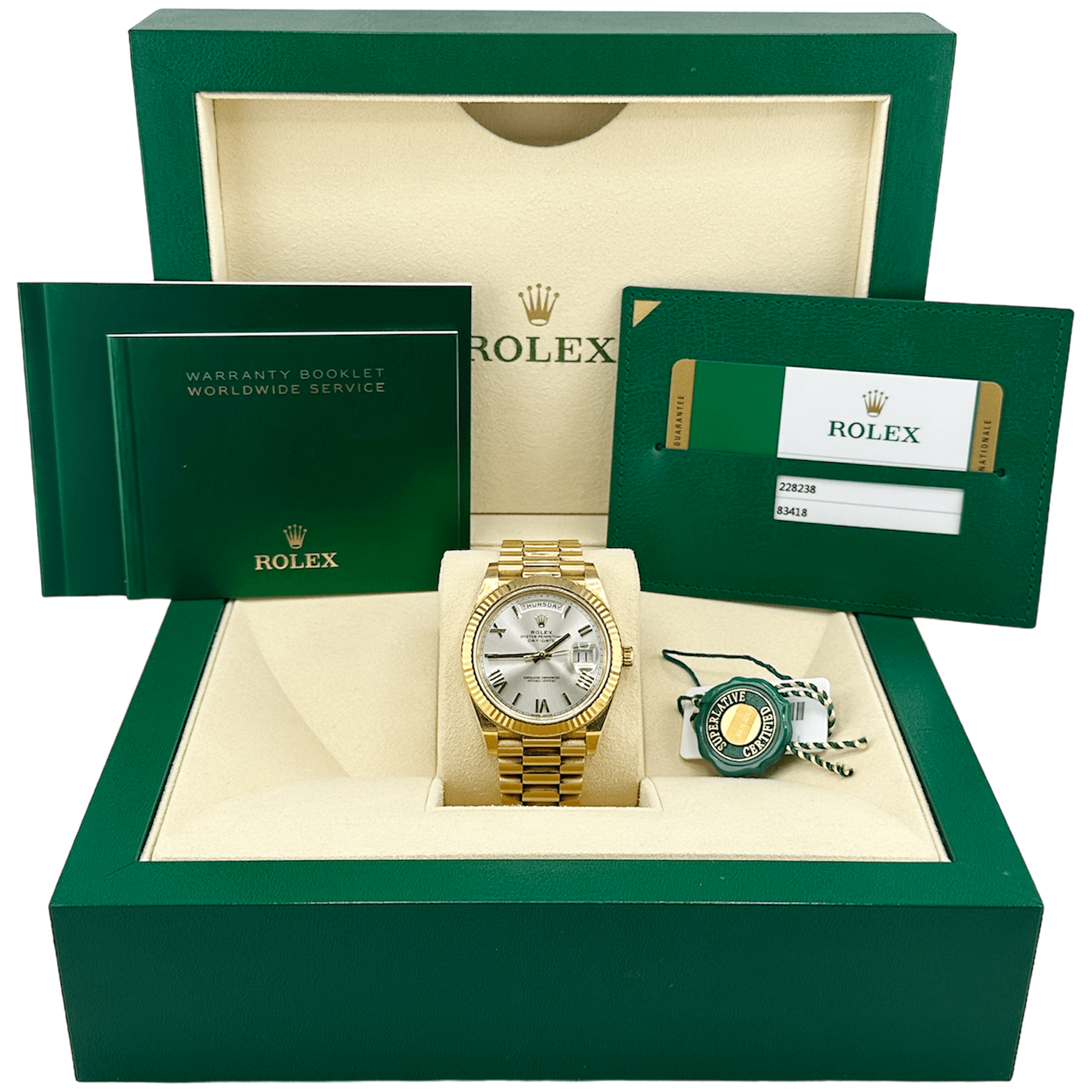 Rolex DayDate 228238 Silver Roman 40mm 18K Yellow Gold WatchGuys