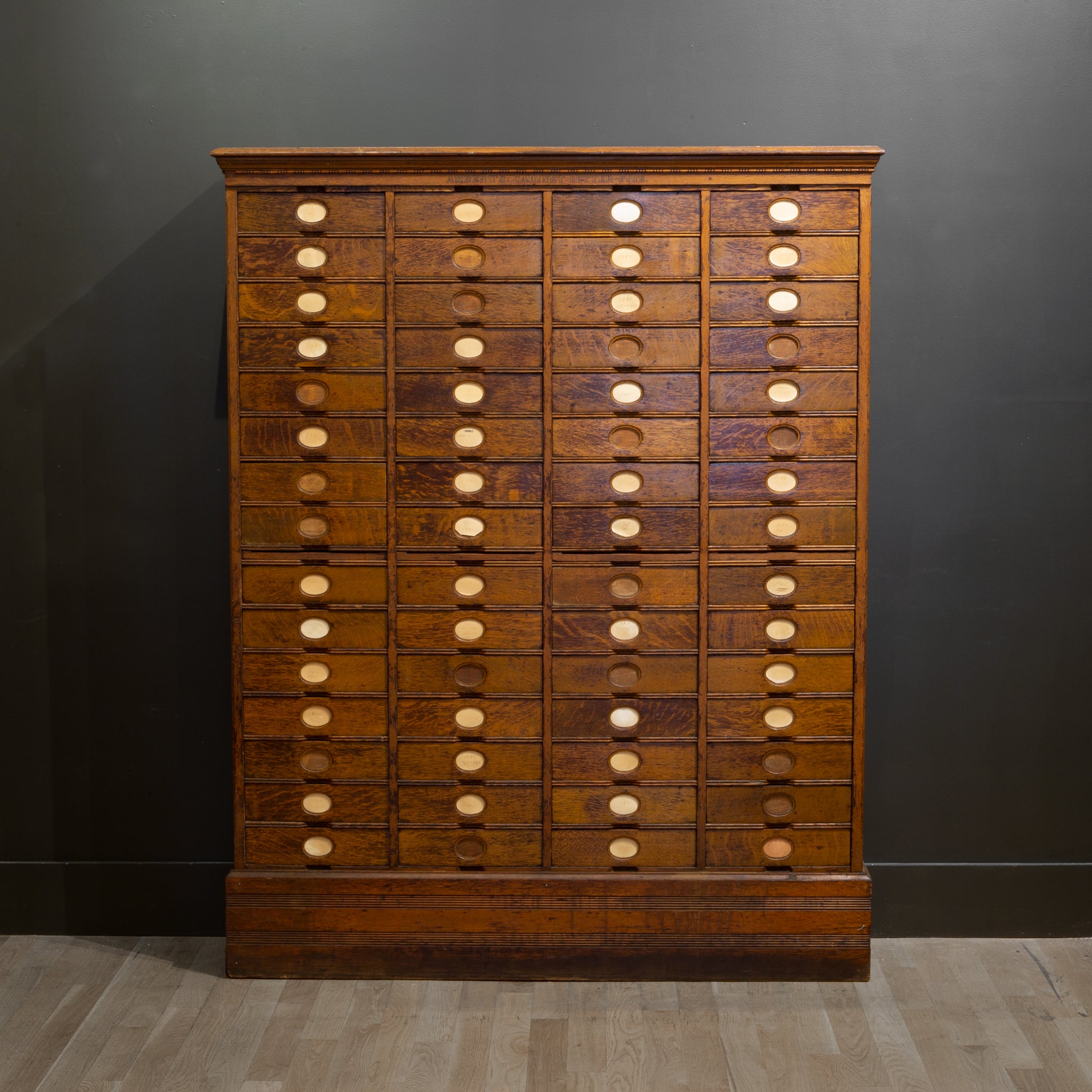 Antique Amberg's Letter File Solid Cherry 060314 1838387125 Amberg Letter File Cabinet A total of 36 drawers. 8 drawers in total, with amberg's patented oval label. A beautiful, rare, letter file cabinet by amberg file & index company with amberg's cabinet letter file stenciled in red and white on the front. One piece case, with tambor door running the full length. This solid oak letter file cabinet shows a drastic grain throughout.. Amberg Letter File Cabinet.