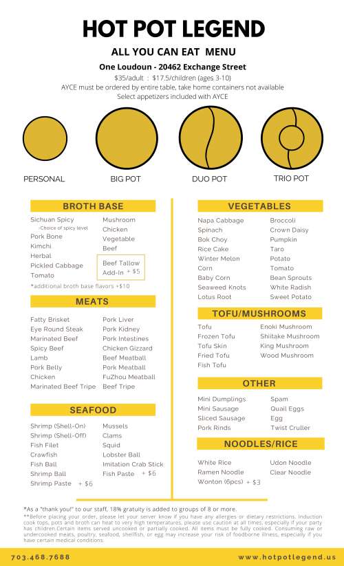 Hot Pot Legend menu in Ashburn, Virginia, USA