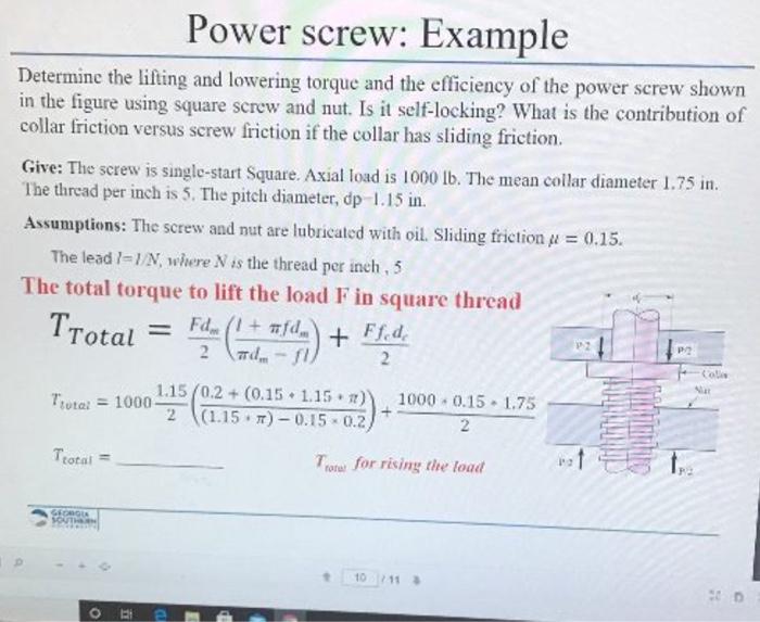 Solved Power screw Example Determine the lifting and
