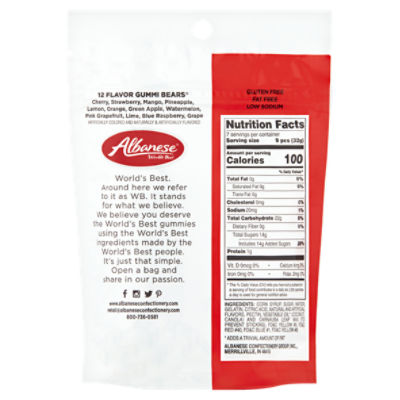 Albanese Gummy Bears Nutrition calories and other nutrition information for gummi bears, 12 flavors from albanese 16 rows gluten & fat free low sodium 10 flavor gummi bear cubs. Calories and nutrition information for albanese. calories and other nutrition information for gummi bears, 12 flavor from albanese world's best. personalized health review for. There are 100 calories in 9 pieces (28 g) of albanese gummi bears. calories and other nutrition information for gummi bears, 12 flavors from albanese There are 70 calories in 16 pieces (50 g) of albanese sugar free gummy bears. albanese candy offers a large selection of sugar free including all sugar free and sugar free 12 flavor gummi bears®. calories and other nutrition information for gummi bears, 12 flavor from albanese Enjoy the best of our sugar free options.
