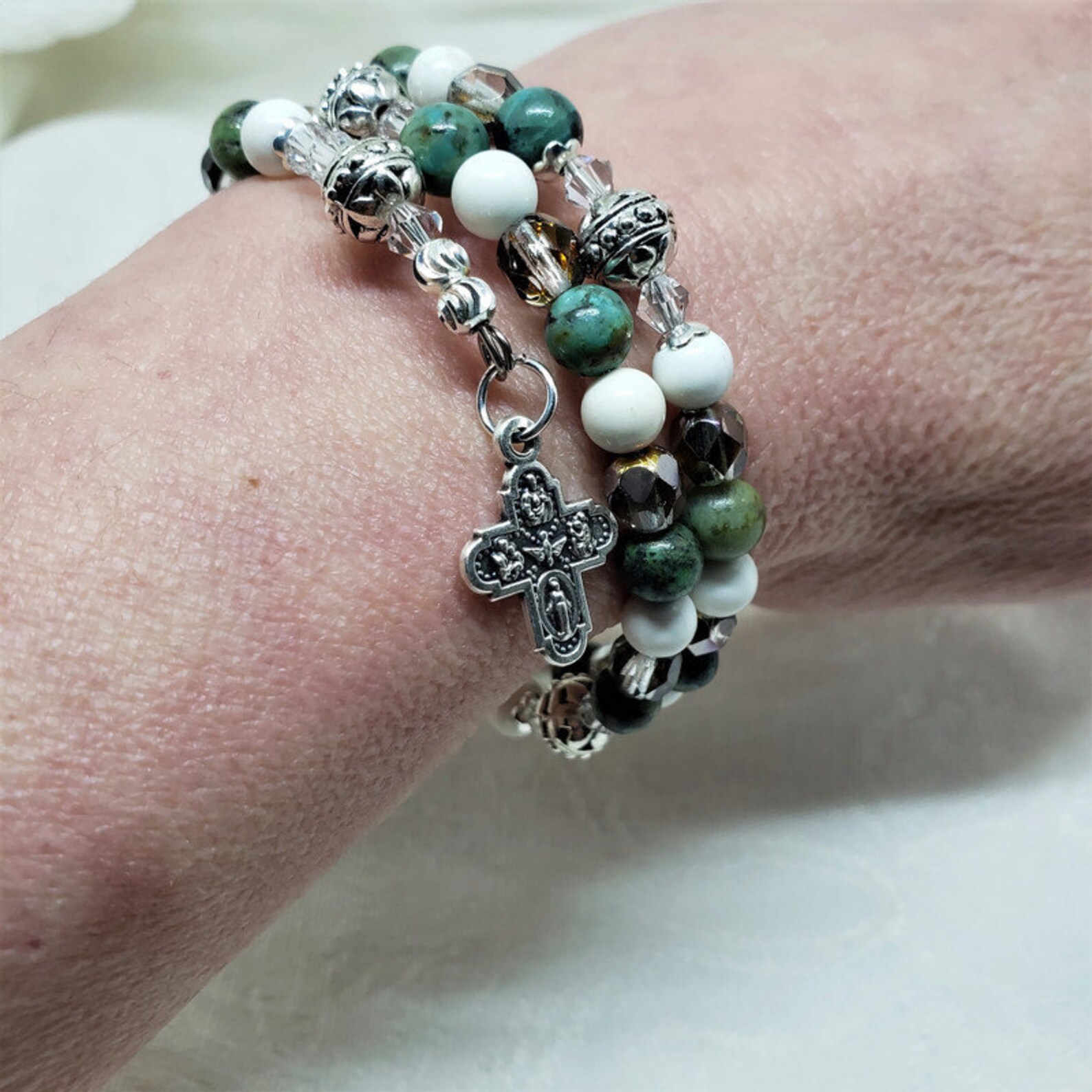 What Is A Wrap Rosary Bracelet . Check out our wrap around rosary bracelets selection for the very best in unique or custom, handmade pieces from our rosaries shops. It features iridescent crystals for. Each of our stretch and wrap rosary bracelets is a full. Wearing a rosary bracelet is a handy way to have a rosary along whenever you want to pray. Wrap this grey and white rosary bracelet around your wrist as a reminder to stop and pray. How to pray on a rosary bracelet: This beautiful gemstone rosary bracelet features magnesite beads as the paters and african green jade beads as the aves. The single decade pocket rosaries are prayed with the same sequence as a. The rosary is a standout “double” sacramental. The catholic church considers the chain of beads that make up the rosary a. Check out our wrap rosary bracelet selection for the very best in unique or custom, handmade pieces from our rosaries shops. It is possible to pray a complete rosary on your bracelet even if. This quick article shows how to pray the rosary using a 1 decade pocket style rosary, or a rosary bracelet.
