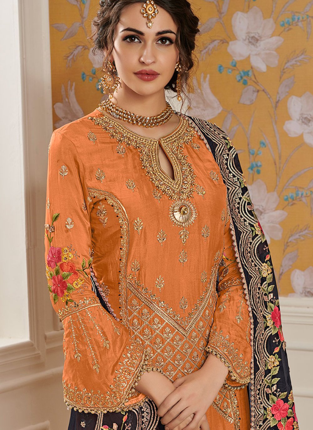 Buy Online Faux Orange Lace Designer Pakistani Suit 107490