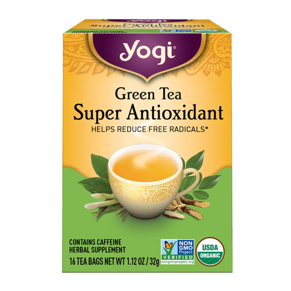 Yogi Tea, Green Tea Super Antioxidant, 16 Tea Bags, 1.12 oz (32 g) Green Tea Super Antioxidant Yogi Yogi green tea super antioxidant tea is purposefully formulated to supply antioxidants and support overall health. Yogi's green tea super antioxidant blend is a green tea containing grape seed extract, licorice root, lemongrass, and other herbs. Green tea—one of the healthiest drinks on the planet—teams up with pomegranate extract, an antioxidant powerhouse. But we really hear the raves for the.. Green Tea Super Antioxidant Yogi.